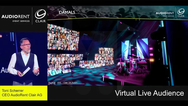 Emotionales und lebendiges Publikum bei digitalen Veranstaltungen? AudioRent Clair hat die Kompetenzen von Ingenieuren, Programmierern und Designern gebündelt, um Veranstaltungen mit reduzierter physischer Anwesenheit so erlebnisnah wie möglich zu gestalten. Die browserbasierte Innovation "Virtual Live Audience" erklärt Andreas Kern, Head of Sales Events bei AudioRent Clair, im Video-Interview mit der ESB.