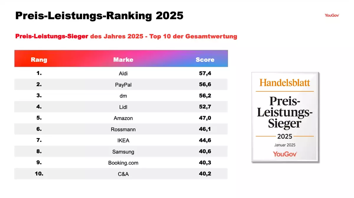 Auf dem 2. Platz findet sich Finanzdienstleister PayPal mit 56,6 Punkten. PayPal war im Oktober 2024 durch YouGov und das Handelsblatt bereits zum wiederholten Mal zur „Marke des Jahres" gekürt worden. In diesem Jahr kann sich der Finanzdienstleister im Vergleich zum Vorjahr um einen Platz verbesser. Damit verweisen Aldi und PayPal den Vorjahressieger des Preis-Leistungs-Rankings, die Drogeriemarktkette dm, in diesem Jahr auf Rang 3 mit 56,2 Punkten.