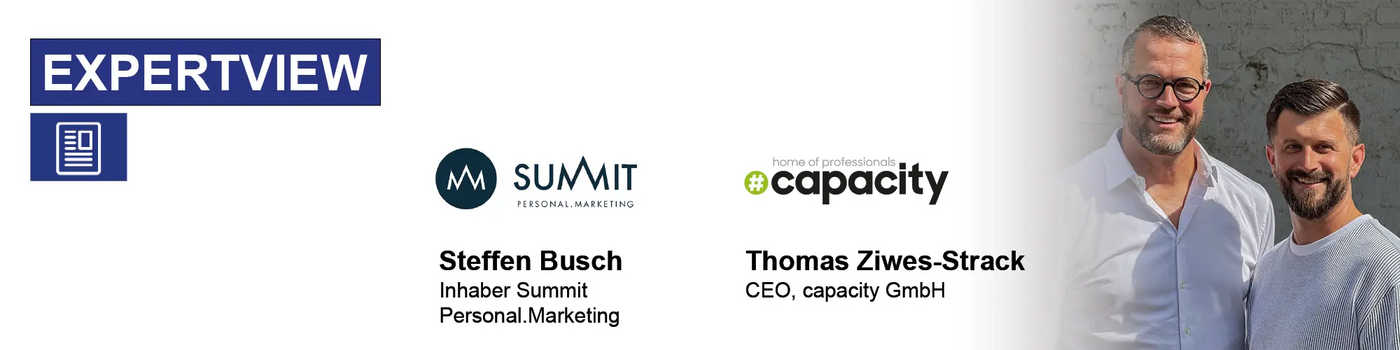 Thomas Ziwes-Strack: Ausgangspunkt ist immer das Ziel des Kunden und häufig ein Veränderungsbedarf. Wir verstehen uns als Sparringspartner, der Anforderungen gemeinsam mit dem Auftraggeber konkretisiert und daraus eine Besetzungsstrategie entwickelt. Das bedeutet: intensives Briefing und Rebriefing statt standardisierter Stellenbeschreibung. Zukünftig profitieren unsere Kunden von zusätzlichen Leistungen: rechtliche Beratung im Freelancer-Markt, Unterstützung beim Employer Branding oder Begleitung in der Organisationsentwicklung. Während capacity vor allem den Bereich Freelancer und Interimslösungen abdeckt, liegt der Schwerpunkt von Summit in der Executive Search. Gemeinsam können wir so ein breiteres Portfolio anbieten, auch verstärkt für den Mittelstand, wo Fachkräftemangel und strategisches Recruiting oft noch Entwicklungspotenzial haben.